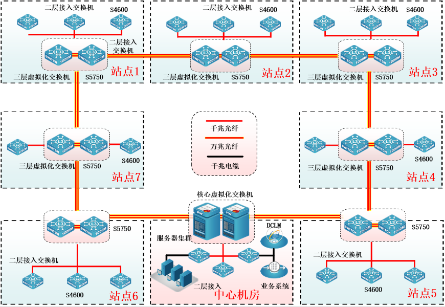 本次网络建设采用环网拓扑结构,顺利获得双万兆互联至分站点。每个站点采用双核心(VSF)虚拟化部署,实现高性能、高可靠、高冗余的特性。